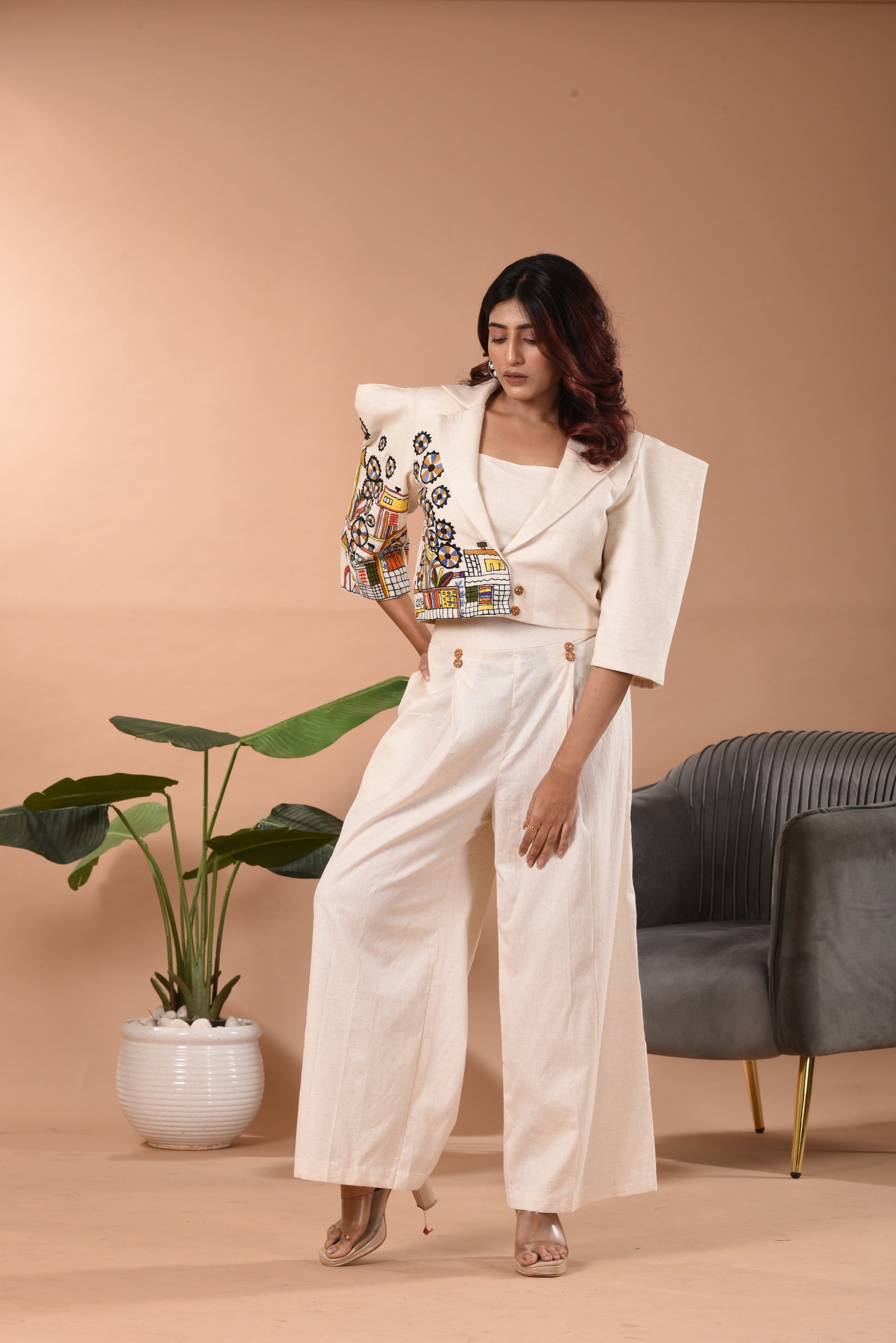 Embroidered Blazer Co-ord Set D 3-Piece in Off-White Kora Linen