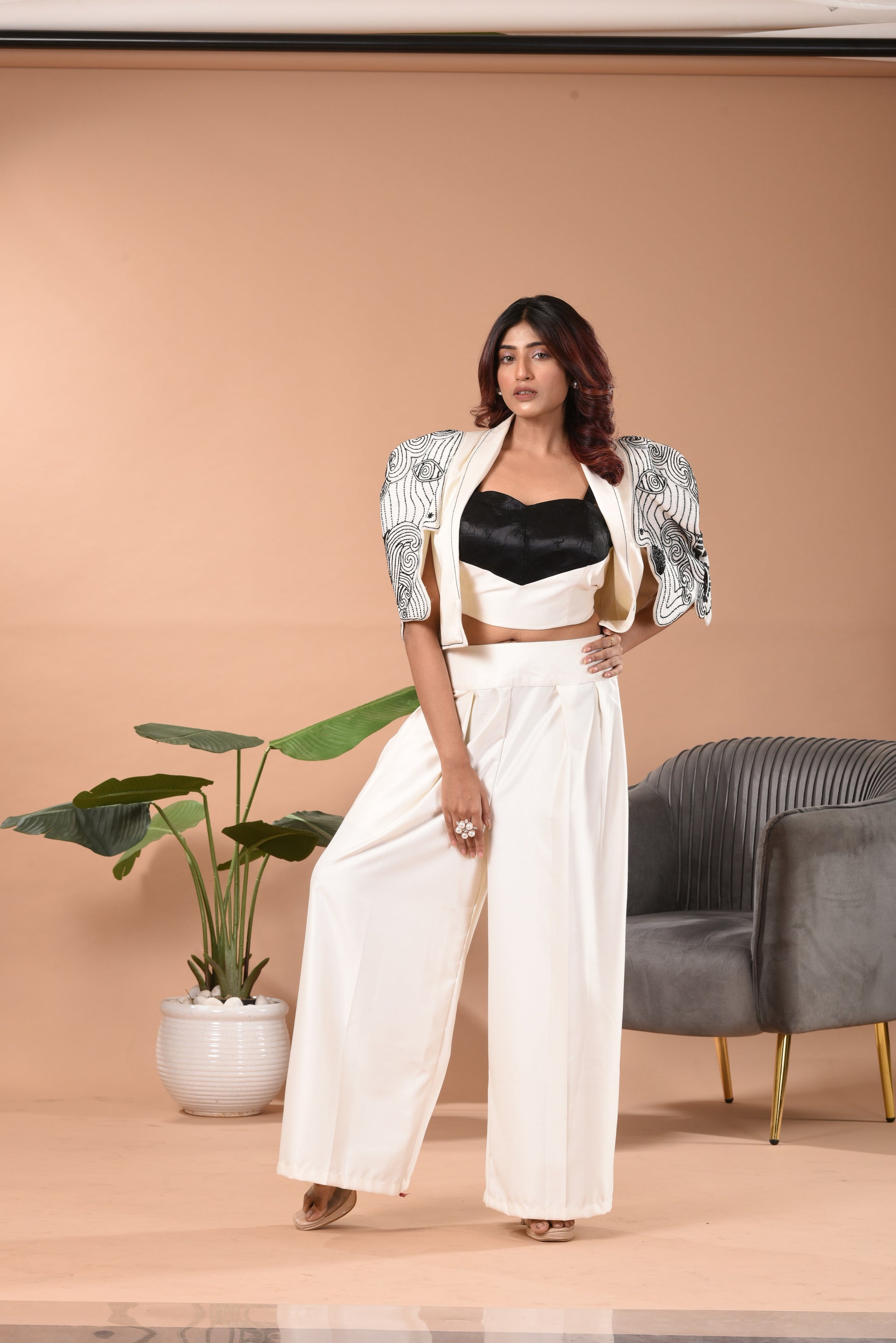 Three-piece set with a hand-embroidered blazer, fitted bustier, and straight pants in white and blue. Easy to style for modern outings. Pair with your favourite heels or flats.