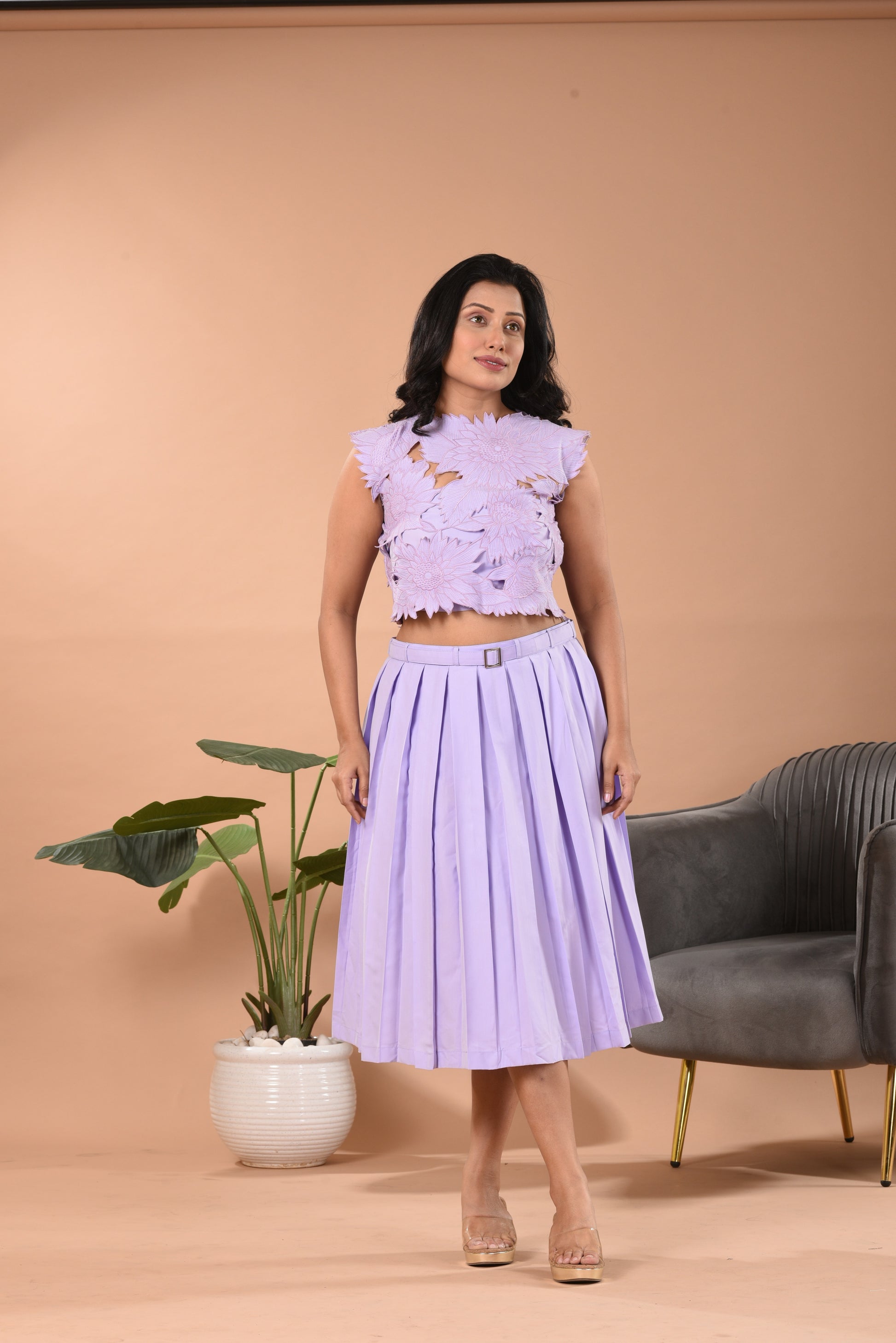 Three-piece co-ord set including a flowy embroidered jacket, bustier, and skirt in imported fabric. Available in lilac, black, and navy. Perfect for western wear and easy statement looks.